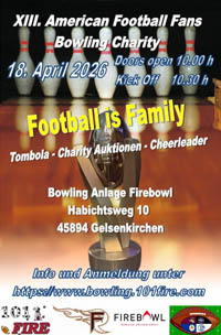 American Football Supporter Clubs "101 Fire" und "Fire Fans Auf Schalke"XIII. American Football Fans Bowling Charity Firebowl, Gelsenkirchen-Buer Samstag, 18. April 2026 Das Jahr 2025 neigt sich dem Ende zu, und 2026 steht bereits in den Startlöchern. Es ist also an der Zeit, gemeinsam nach vorne zu blicken. Ganz gleich, ob ihr Fans der AFVD, NFL, ELF oder EFA seid - wir möchten mit euch, den leidenschaftlichen und manchmal auch etwas verrückten Football-Fans, einen sportlichen "Season Opener" feiern. Daher laden wir euch herzlich zur 13. Ausgabe unserer American Football Fans Bowling Charity ein. Dieses Turnier ist längst Tradition und verbindet sportlichen Ehrgeiz mit einem guten Zweck. Veranstaltungsdetails Datum: Samstag, 18. April 2026 Ort: Firebowl, Habichtsweg 10, 45894 Gelsenkirchen-Buer Einlass: ab 10:00 Uhr Turnierbeginn: ca. 10:30 Uhr Ende: gegen 18:00 Uhr Insgesamt können 20 Teams mit jeweils vier Spielern teilnehmen. Die Teams dürfen selbstverständlich gemischt sein - Hauptsache, ihr habt Spaß am Spiel. Den genauen Turnierplan sowie den Ablauf findet ihr in den beigefügten PDF-Dateien. Teilnahmebedingungen Die Startgebühr beträgt 90 Euro pro Team und beinhaltet die Leihschuhe. Damit liegt der Beitrag nur geringfügig über dem Vorjahr - ein moderater Anstieg, der dank des Entgegenkommens von Firebowl möglich war. Eigene Bowlingbälle dürfen verwendet werden, allerdings übernehmen wir keine Haftung bei eventuellen Schäden. Anmeldung Bitte meldet euer Team per E-Mail an: bowling(at)101fire.com. Die Plätze werden nach dem Prinzip "first come - first serve" vergeben. Bei der Anmeldung gebt bitte euren Teamnamen sowie die Namen der Teammitglieder an. Falls ihr bereits ein Team-Logo habt, könnt ihr es direkt mitschicken - alternativ auch später nachreichen. Nach Eingang eurer Anmeldung erhaltet ihr eine E-Mail mit den Zahlungsinformationen (Bankverbindung oder Paypal-Adresse). Sobald die Startgebühr bei uns eingegangen ist, bekommt ihr eine Bestätigungsmail. Erst dann ist eure Anmeldung verbindlich. Preise und Tombola Wie in jedem Jahr gibt es Pokale für die Siegerteams und Urkunden für alle Teilnehmenden. Zusätzlich planen wir wieder eine Tombola mit attraktiven Preisen. Dafür sind wir auf eure Unterstützung angewiesen: Wenn ihr Kontakte zu Firmen habt, die Sachspenden beisteuern könnten, freuen wir uns über eine kurze Nachricht. Für den guten Zweck Der gesamte Erlös der Veranstaltung geht erneut an die Elterninitiative Kinderkrebsklinik e.V. Düsseldorf. Mit eurer Teilnahme unterstützt ihr also nicht nur den Sport, sondern auch eine wichtige soziale Einrichtung. Rahmenprogramm und Verpflegung Für das leibliche Wohl sorgt die Küche des Firebowl mit einer kleinen, aber feinen Turnierkarte. In der "Halftime"-Pause planen wir einen Auftritt von Cheerleadern, und vielleicht gibt es auch wieder einige Memorabilien, die wir versteigern können. Bei Fragen oder Anregungen stehen wir euch jederzeit gerne zur Verfügung. Wir freuen uns auf einen sportlichen, unterhaltsamen und solidarischen Tag mit euch. Euer "Joshi" und euer "Steini" |